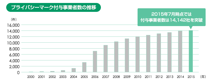 プライバシーマークの取得は事業者に義務付けられているわけではありませんが、取引や入札などの条件として求められてきた結果、取得する事業者は増え続け、2009年には10,000社を超え、現在(2015年7月本記事執筆時点)は14,142社を突破しています。