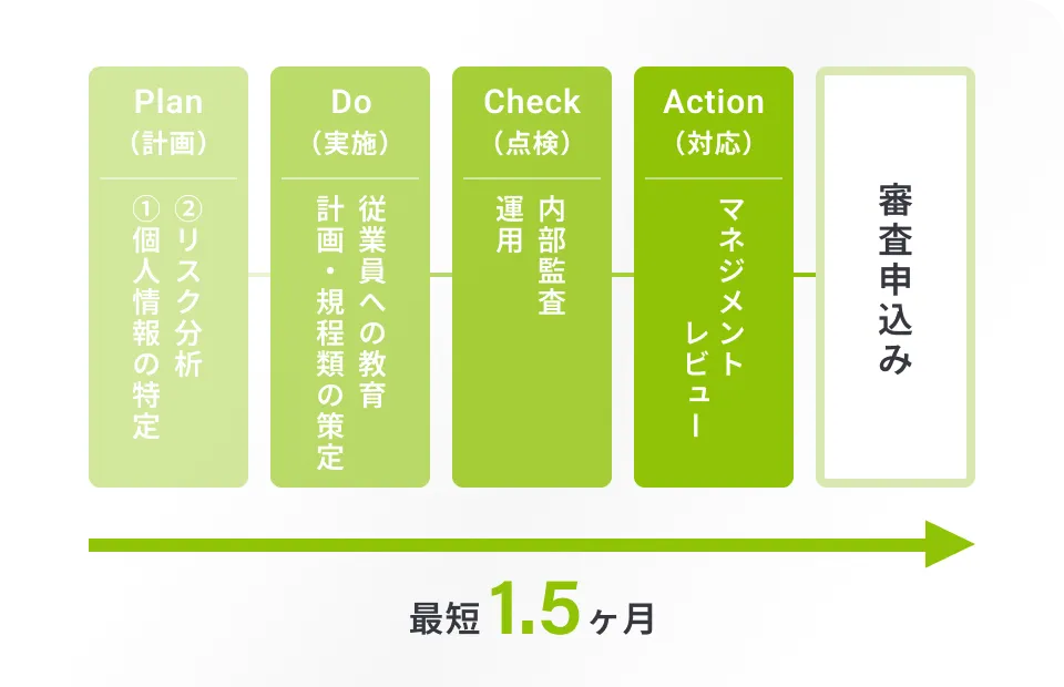 一般的には6ヶ月〜1年程度ですが、セキュリティ本舗では独自のスキームにより最短1.5ヶ月での申請実績もございます。企業規模や現状の体制によって異なりますので、まずはご相談ください。